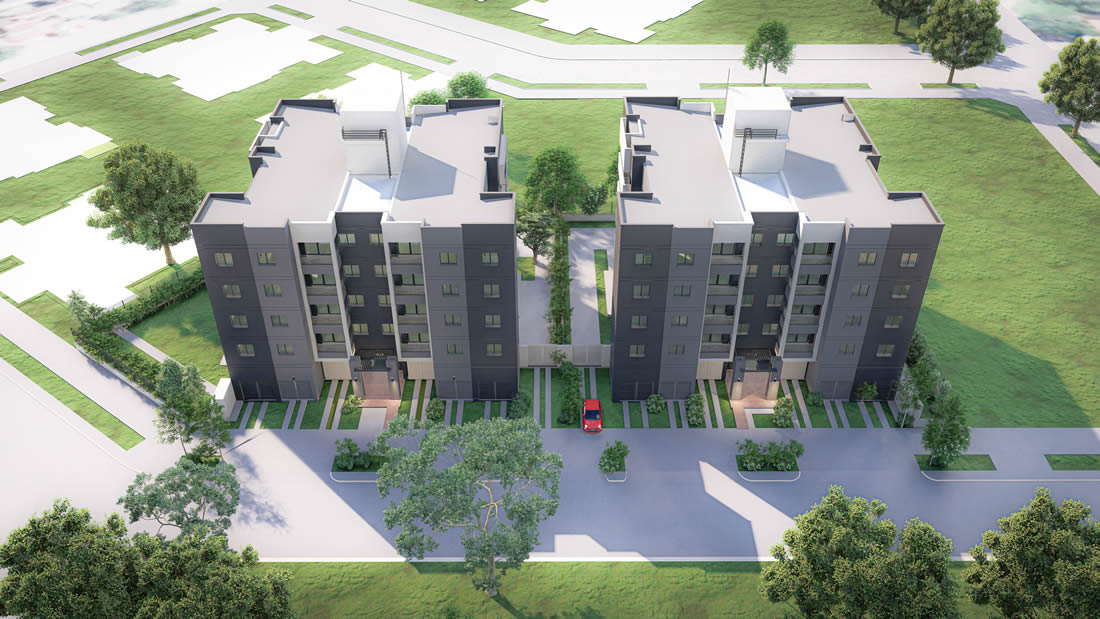 Dos de los departamentos del primer piso se adaptarían para personas con discapacidad. Todos los departamentos tienen dos dormitorios, un baño y balcón.